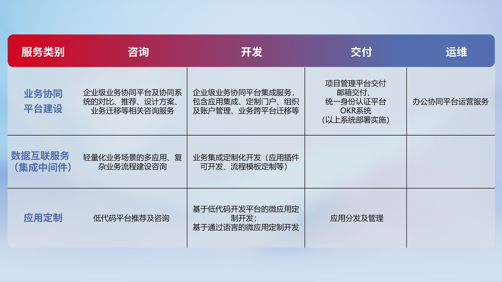 针对钉钉、、、、企微、、、IDaas等平台级产品提供产品的规划、、方案、、、交付、、、、定制化开发等服务,,,,实现如统一协同办公、、、、智能客户服务、、混合会议管理、、、智能数据查询、、等业务场景,,,,实现数字化转型。。